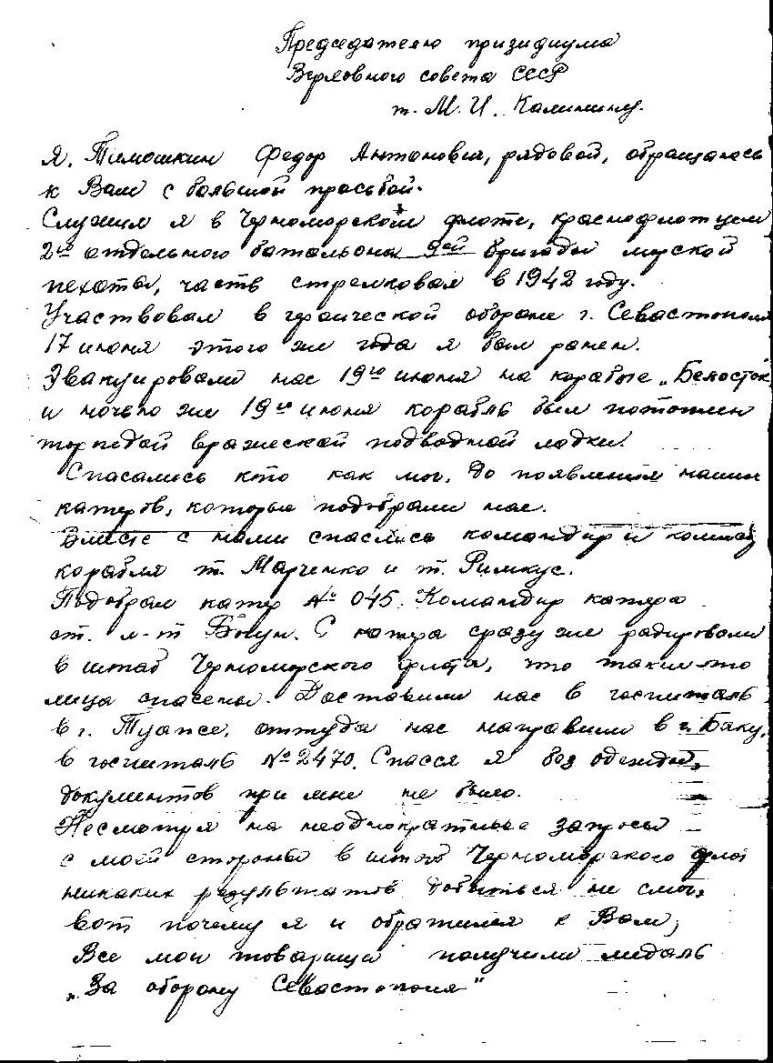 Мой дед Тимошкин Федор Антонович был на этом корабле "Белосток",вот объяснительная ,при каких обстоятельствах утеряны документы.Он спасся