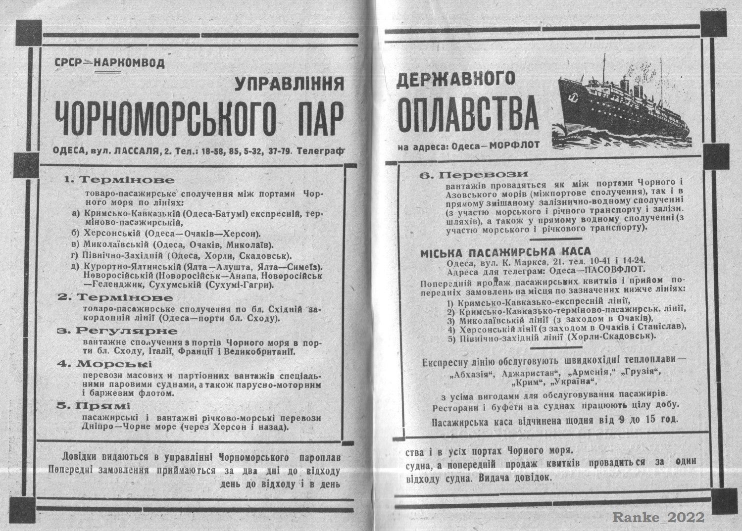 На фрагменте фото также, слева - направо, у причалов Морвокзала пришвартованы три советских пассажирских судна тогдашнего ЧМП: СПК "Вихрь" (у 20 причала), предположительно теплоход "Литва" (у 19 причала), и бывший Германский дизель-электроход "Patriа" (1938), носивший в тогдашнем СССР название его территориально-крупнейшего административного субъекта (у 15 причала).