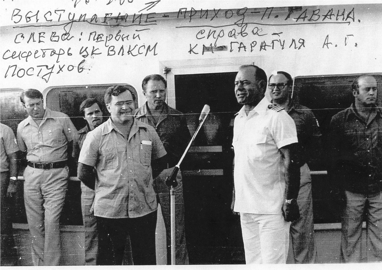 7 июля 1978 года перед приходом в порт Одессу, капитан Гарагуля – вызвал меня и спросил: - «Готова ли судовая радиотехническая служба, к предстоящему рейсу - для доставки участников фестиваля на остров Свободы – Кубу?» – Да, - доложил я, но у меня есть вопрос:- касающийся предоставления служебных - радиотелефонных переговоров для сопровождающих, компетентных - товарищей из разных ведомств, с оплатой за чей счет? – «ЗА СЧЕТ ЦК ВЛКСМ ПОД ЭГИДОЙ ОРГАНИЗАЦИИ – «СПУТНИК», ОТВЕЧАЮЩИЙ ЗА МЕЖДУНАРОДНЫЕ ПЕРЕВОЗКИ, - СОВЕТСКИХ ТУРИСТВ – поясняет Анатолий Григорьевич. Далее идет уточнение - только для «СЛУЖЕБНОГО ПОЛЬЗОВАНИЯ»-/ С выходом судна из Одессы эта информация будет доведена для всех членов экипажа и просьба – БЫТЬ БДИТЕЛЬНЫМИ, каждому по своему заведованию/ - «Кубинские контрреволюционеры – заявили, что они готовы: - «К провокациям, против – Советских теплоходов, на борту, на которых будут доставляться участники фестиваля, в плоть - до подрыва их в Европейских портах - захода этих судов». «Предупреждать каждое лицо, для переговоров по радио, НЕ КАКИХ – КООРДИНАТОВ!» «Случаи не соблюдения – предупреждения, выключать радиопередатчик». «Меня по пустякам не дергать, «сопровождающие лица» - люди ответственные и подготовленные, с этого момента вся ответственность за допущенные нарушения – ложиться на «Ваши плечи», если у Вас не будет «проколов», после этого рейса – будет продолжать работать на «Грузии» …