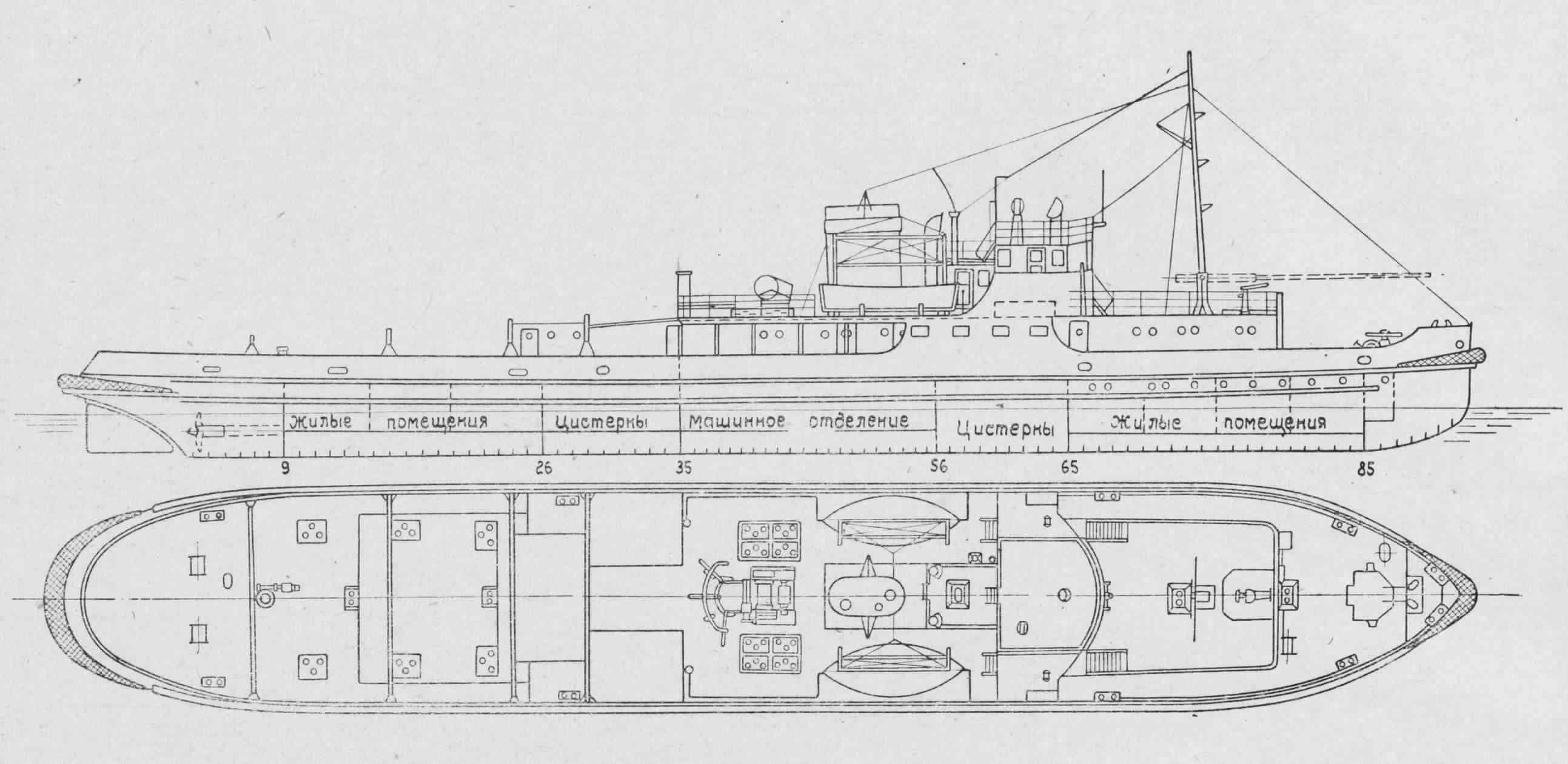 Главный двигатель – два дизеля – 6ДР 30/50, Русский дизель, Ленинград, 600 элс, 300 об/мин.