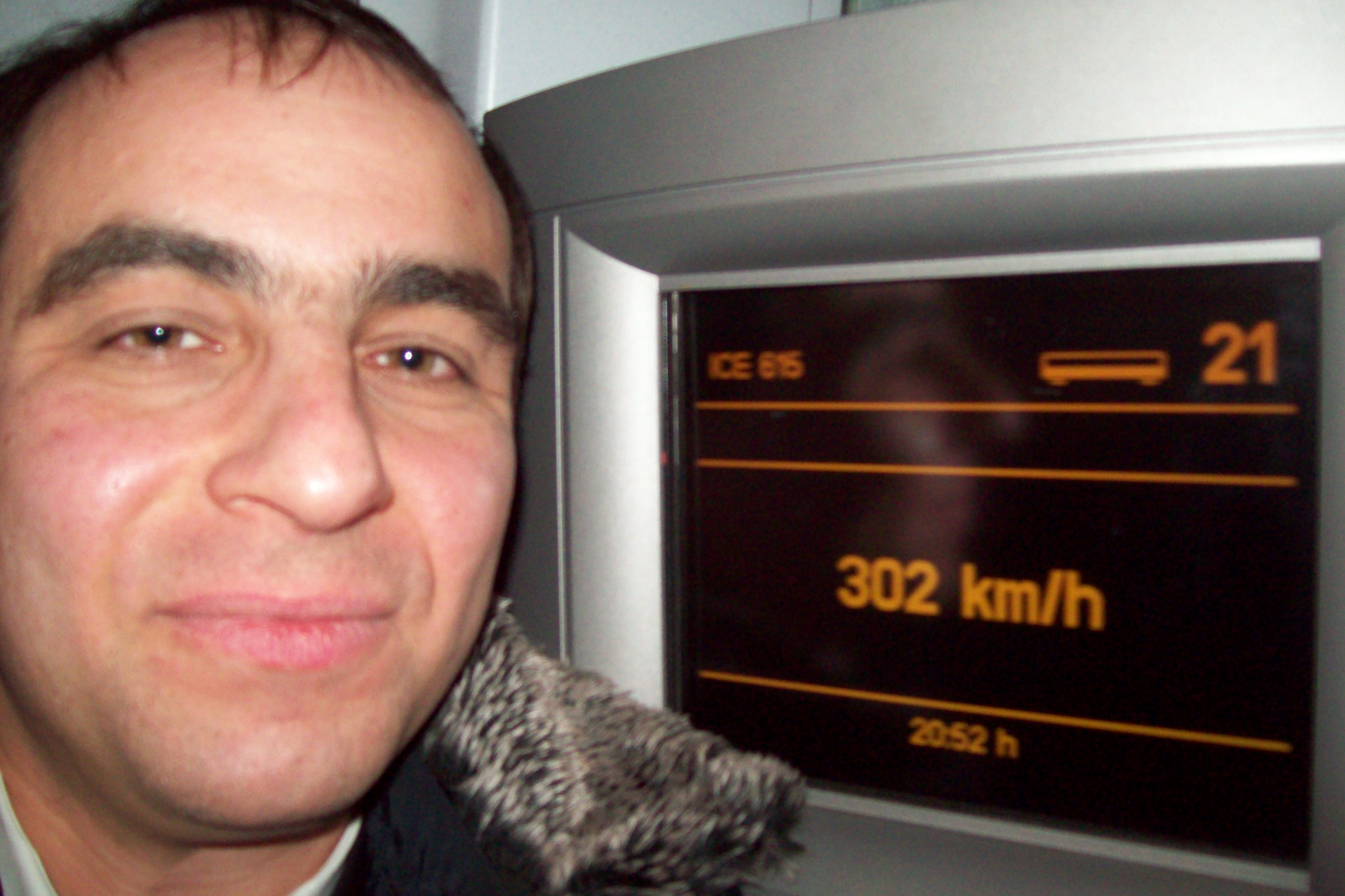 На сверхскоростном участке между Бонном и Аэропортом Франкфурта-на-Майне наш поезд развивал максимальную скорость 282 км/час. До заветных 300 км/час всё же не дошло, видимо потому, что было тёмное время суток. Но тем не менее я побил свой собственный рекорд скорости на немагнитных железных дорогах, который раннее составлял 251 км/час. Средняя скорость на этом участке составляла 260 - 270 км/час. Этот отрезок пути проходит по специальной линии, построенной только для скоростного движения, другие поезда на неё не пускаются. За всё время движения по этому участку мы разминулись лишь с одним встречным поездом.